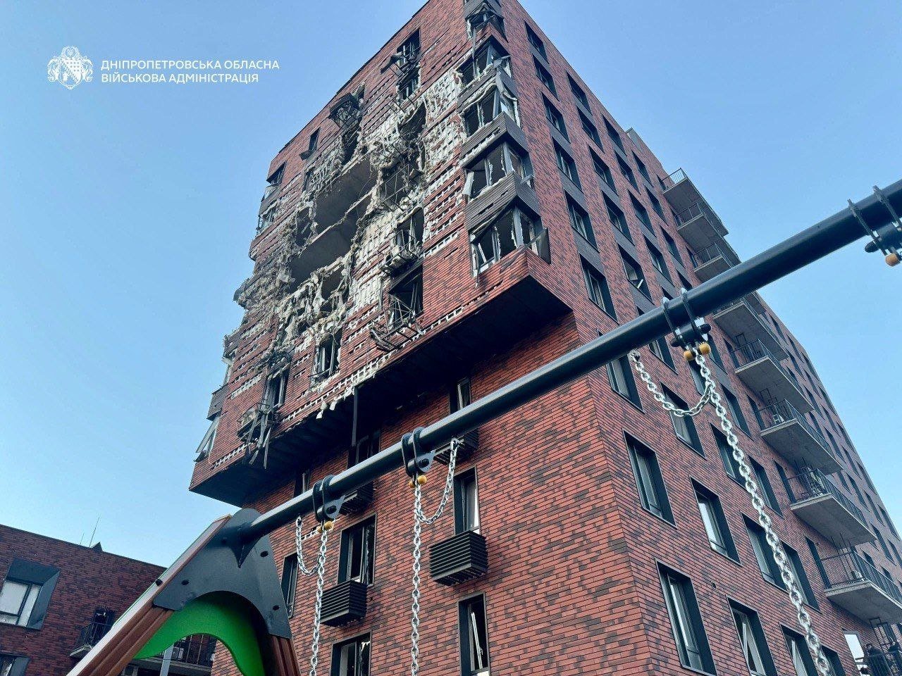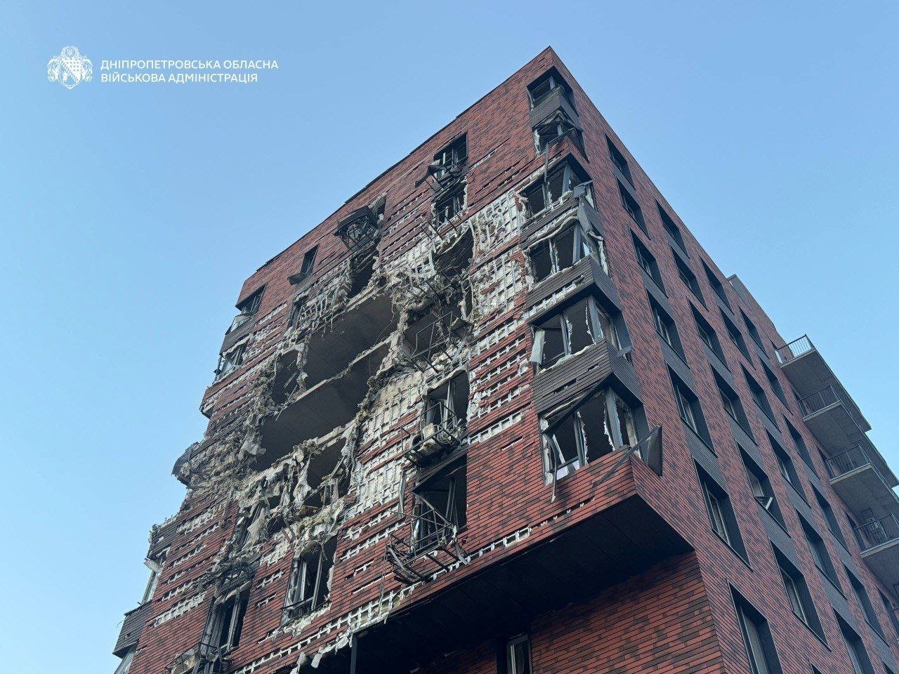 - Понівечена дев'ятиповерхова новобудова.